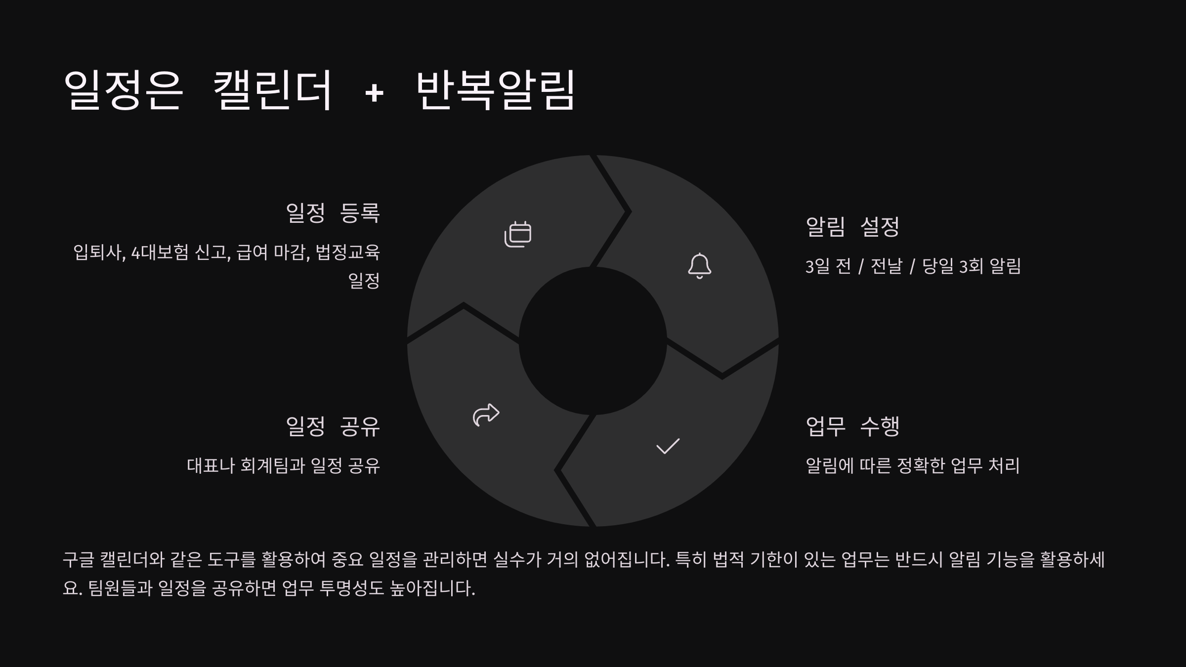 📅 입퇴사, 4대보험 신고, 급여 마감, 법정교육 일정