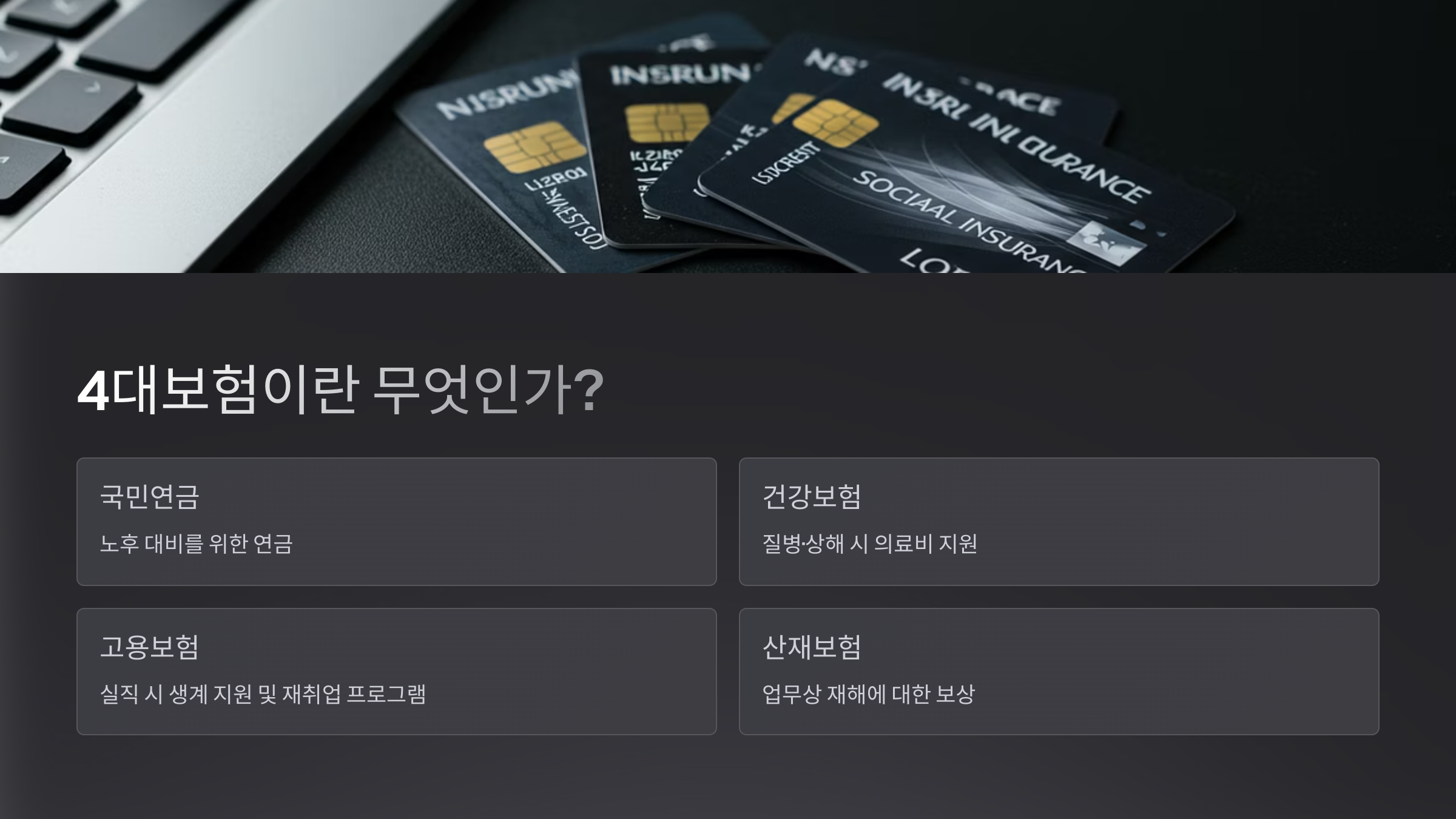 4대보험이란 국민연금, 건강보험, 고용보험, 산재보험을 묶어 부르는 말로, 근로자의 기본적인 사회보장을 위해 사업장에서 의무적으로 가입해야 하는 제도입니다.
