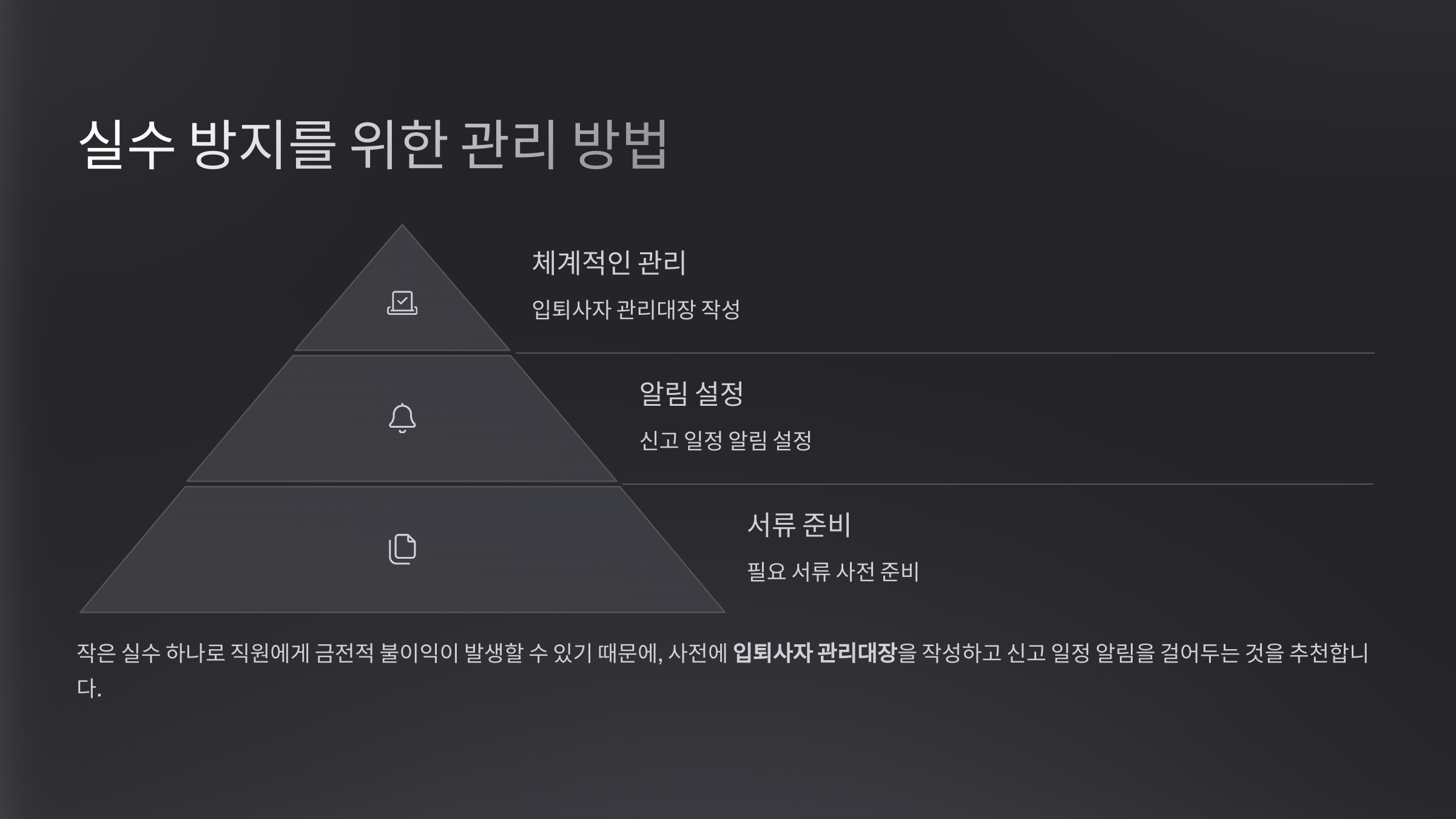 💡 작은 실수 하나로 직원에게 금전적 불이익이 발생할 수 있기 때문에, 사전에 **'입퇴사자 관리대장'**을 작성하고 신고 일정 알림을 걸어두는 것을 추천합니다.